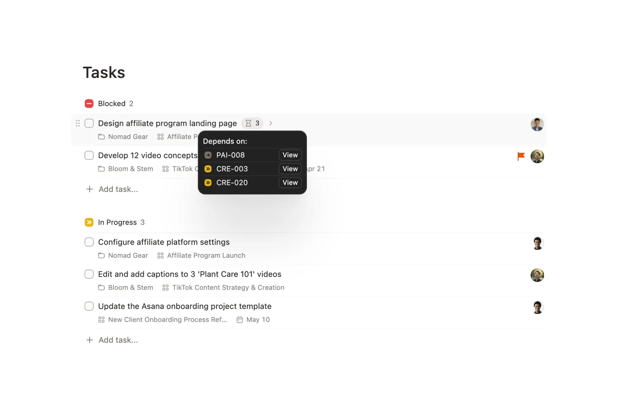 The blocked task gets a small badge in list and board view that you can hover to see what the blockers are, and their status.