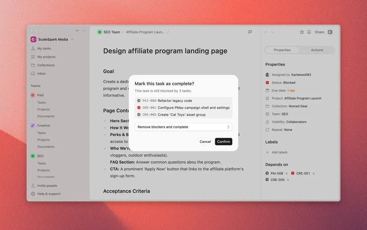Hit "Add subtask" in the task detail view and start breaking work into smaller, checkable pieces. Each subtask is a full task with its own status, assignee, and labels, just nested inside a parent.